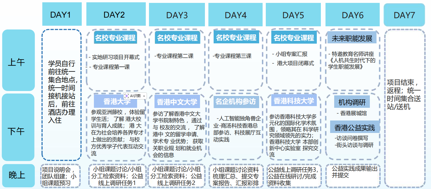 探访世界名 校,感受浓厚学术氛围;与名 校优 秀学子互动交流,感受榜样的力量,了解香港教育体制与名 校人才培育成果;拓展国际视野,激发创新意识和创造力。
