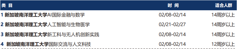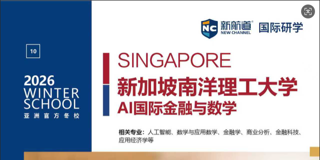 摘要:上海新航道2026年寒假研学营来了:新加坡南洋理工大学实地访学冬令营【AI国际金融与数学】,针对14周岁以上学生,招生已开启!详情咨询在线客服!