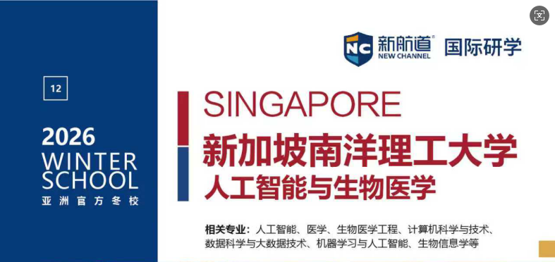 摘要:上海新航道2026年寒假研学营来了:新加坡南洋理工大学实地访学冬令营【人工智能与生物医学】,针对14周岁以上学生,招生已开启!详情咨询在线客服!