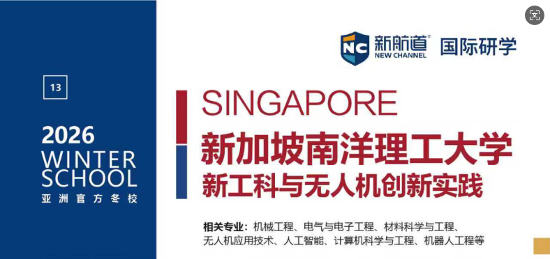 摘要:上海新航道2026年寒假研学营来了:新加坡南洋理工大学实地访学冬令营【新工科与无人机创新实践】,针对14周岁以上学生,招生已开启!详情咨询在线客服!