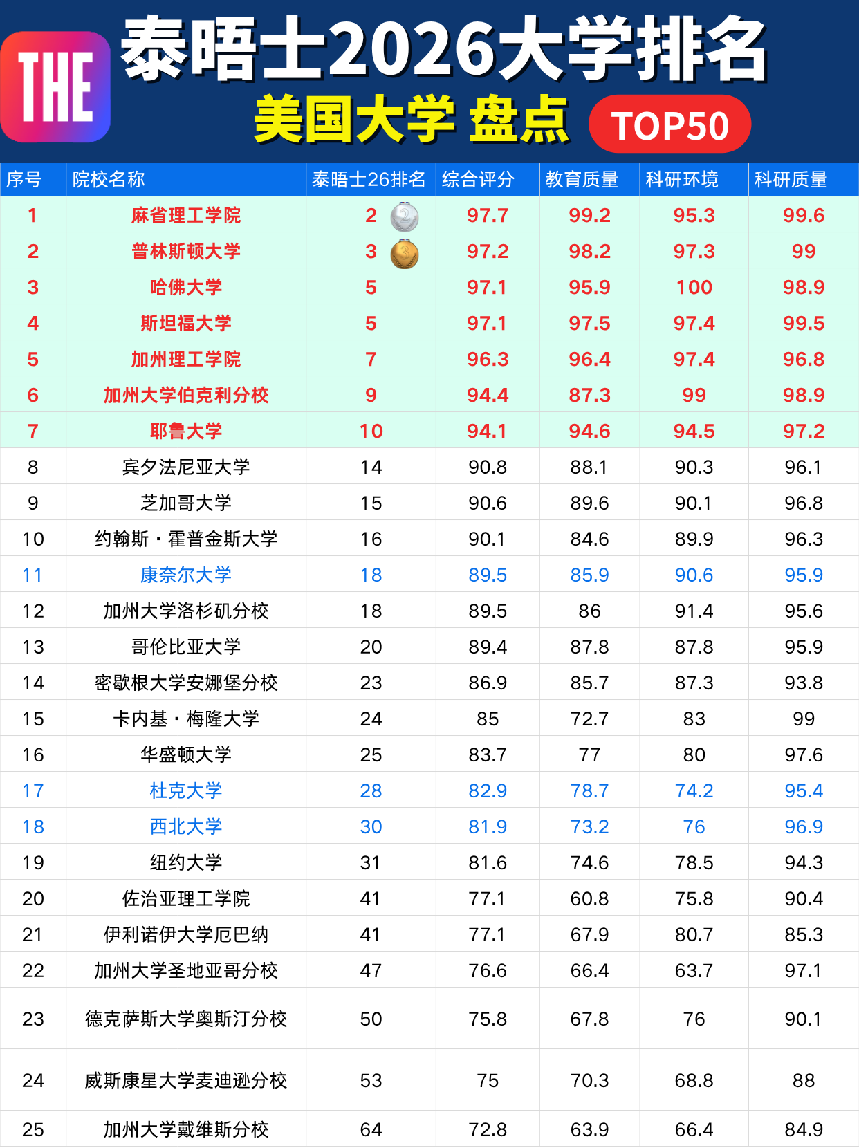 2026泰晤士大学排名出炉!美国高校表现全解析