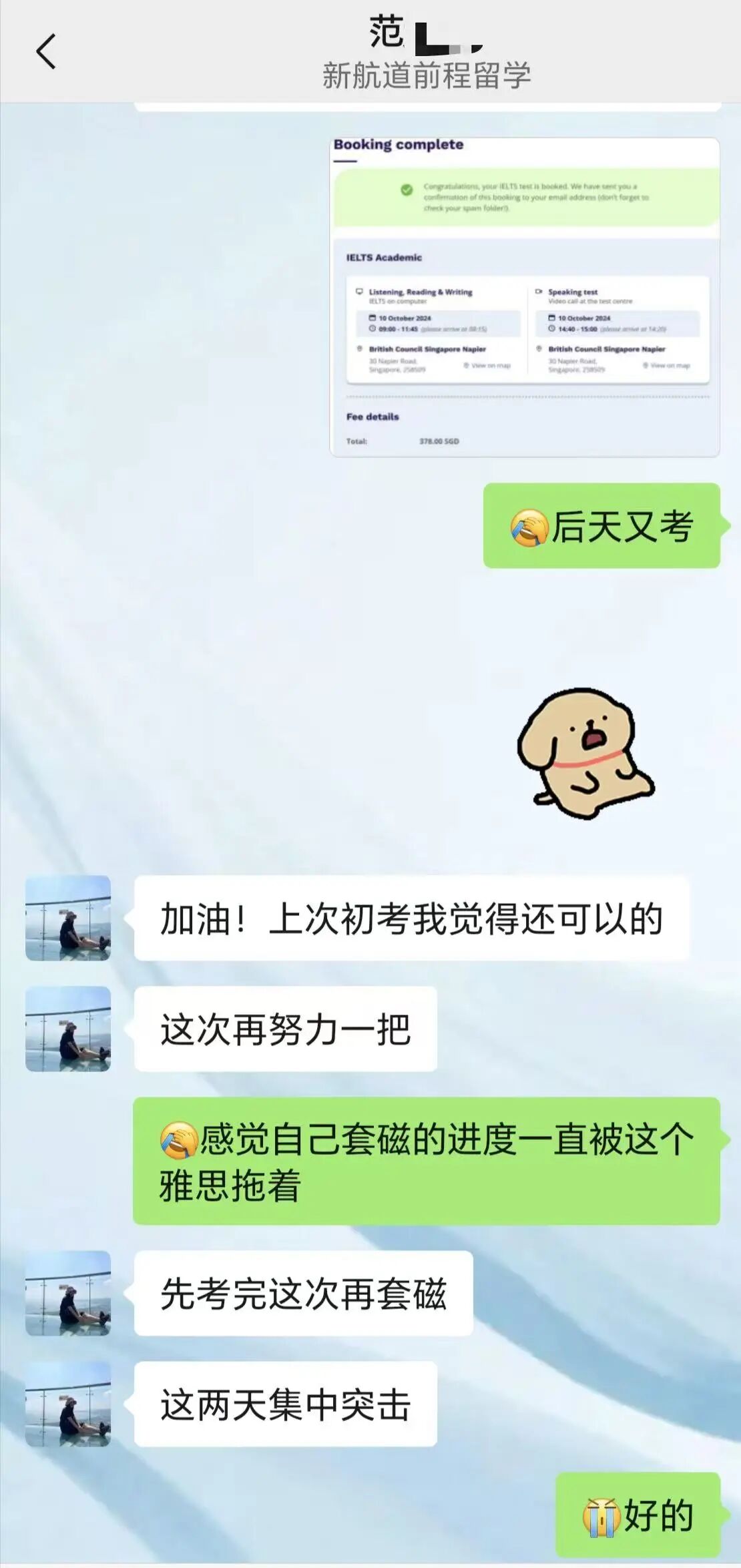 我姐姐之前就是在新航道学的雅思,后来也是通过新航道前程留学完成了她的硕士申请,整个过程她觉得挺靠谱、服务也细致,就推荐给了我。所以我在本科阶段准备雅思的时候,就直接来了新航道。那会儿上课、模考、老师给的备考建议都挺对路,成绩也考得不错,慢慢建立了信任感。