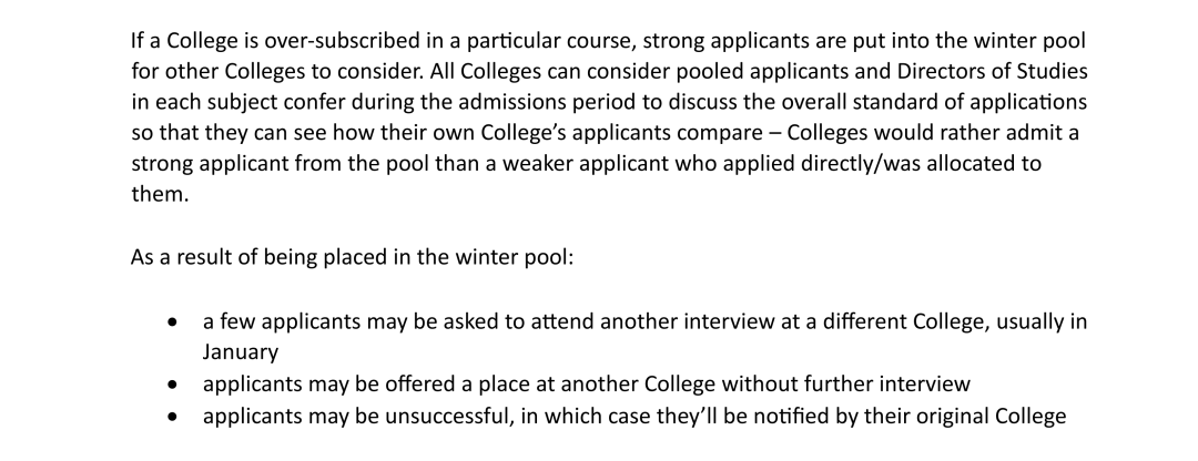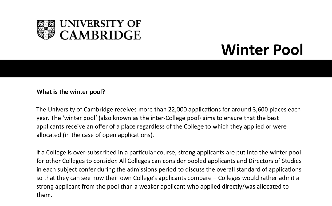 剑桥大学每年收到约22,000份本科申请,而录取名额仅约3,600个。为确保最 优 秀的申请者不会因学院选择或名额限制而被错过,大学设立了Winter Pool(亦称跨学院调剂池)机制。