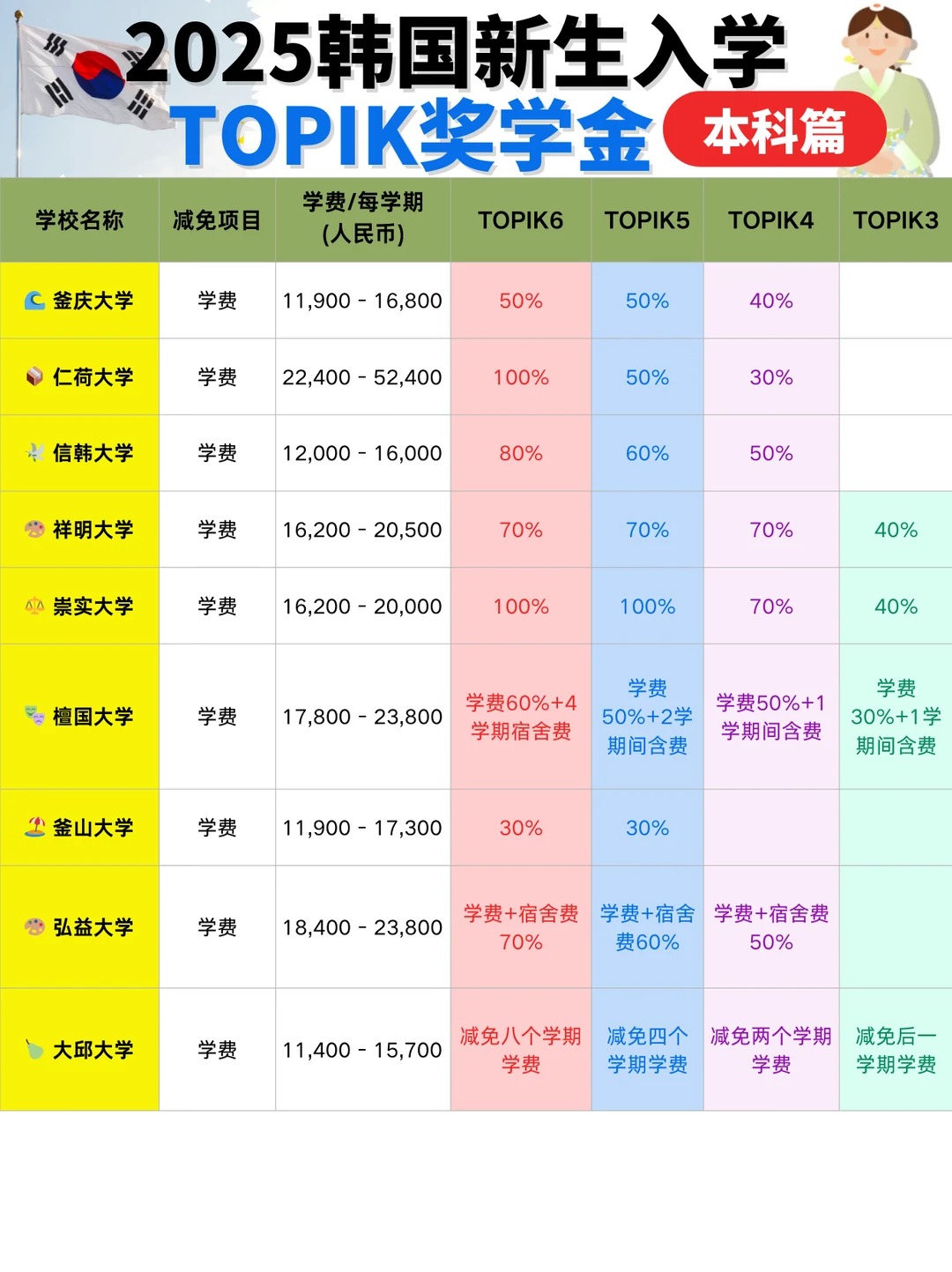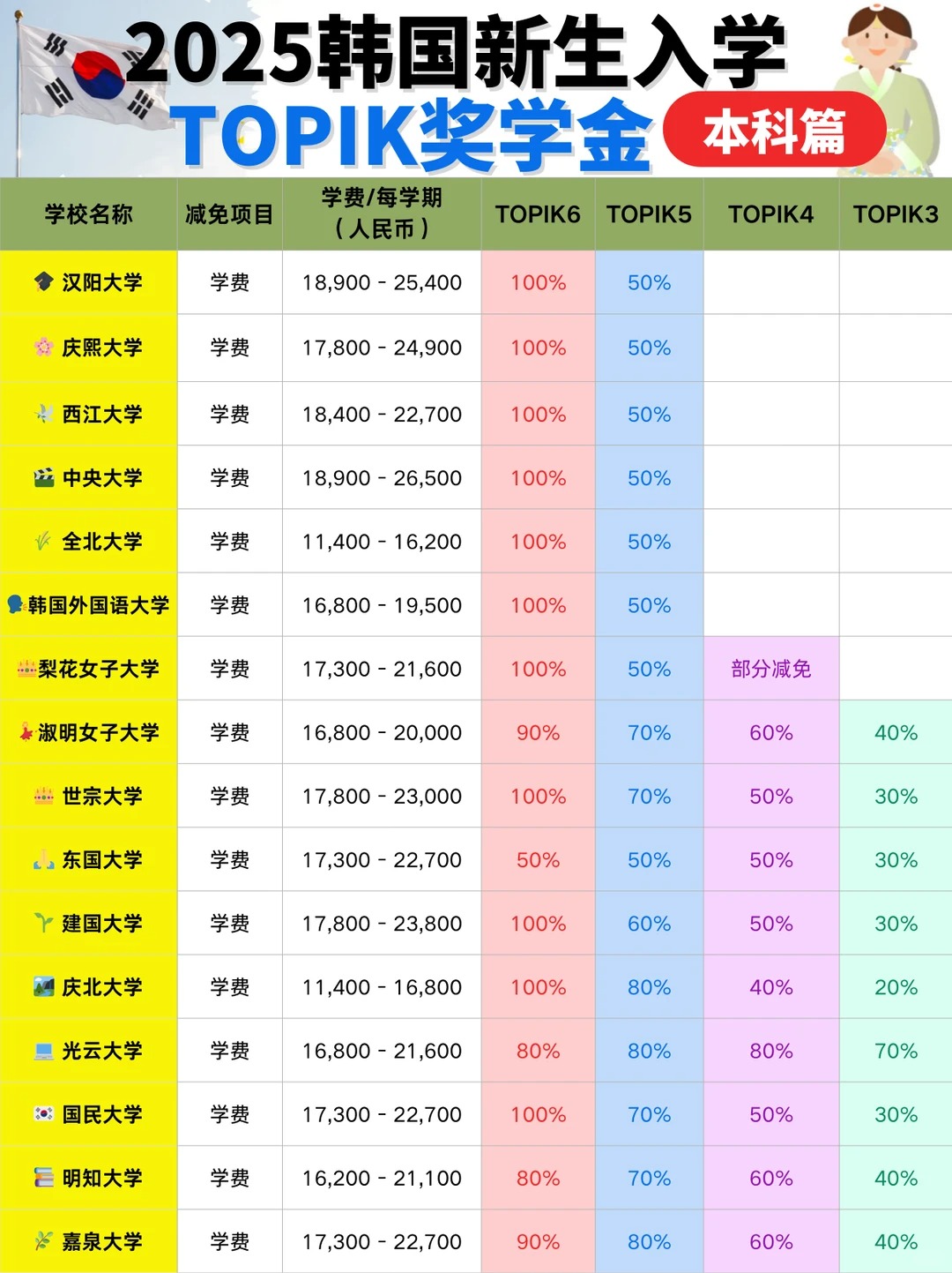 准备赴韩留学的新生看过来!一份优 秀的TOPIK成绩单不仅是入学的敲门砖,更是开启“奖学金宝藏”的金钥匙。许多韩国大学为鼓励优 秀国际生,特别设置了以语言成绩为核心的新生奖学金,其中最 高等级的TOPIK6级甚至可能直接兑换成“学费全免”的惊喜福利!本攻略为你梳理本科阶段凭韩语成绩斩获奖学金的要点与院校清单,助你轻松减轻留学经济负担。