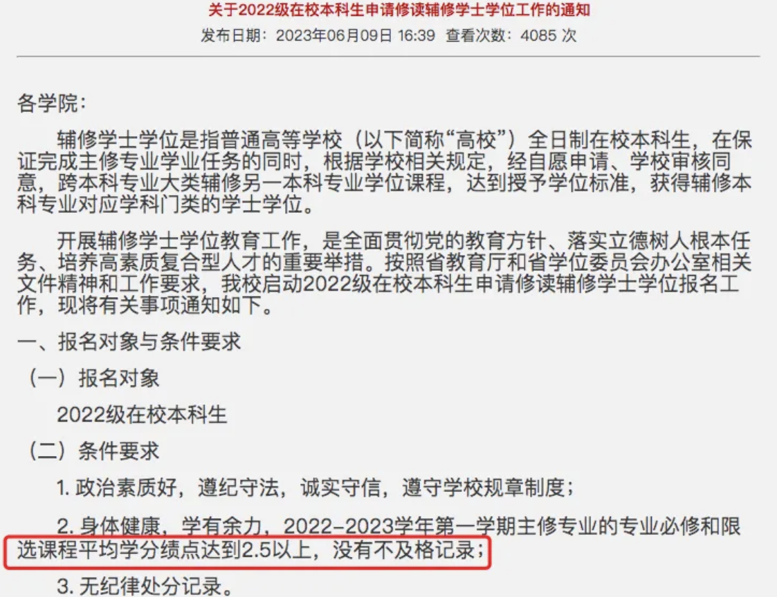 同样的,申请辅修双学位也有明确的绩点要求。