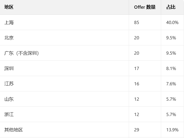 北京、广东(不含深圳)各获20枚Offer,占比均约9.5%;