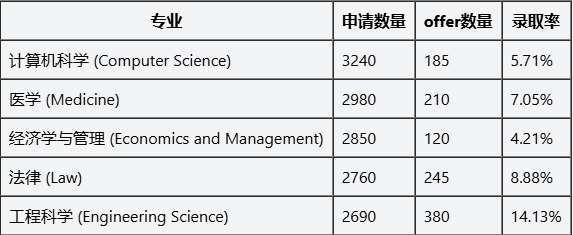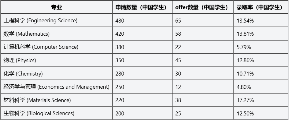 传统优势理科表现稳定:工程科学、物理录取率超18%,数学、化学录取率超11%,这类专业考核标准客观、选拔路径清晰,契合中国学生的学术优势,是申请主流方向。