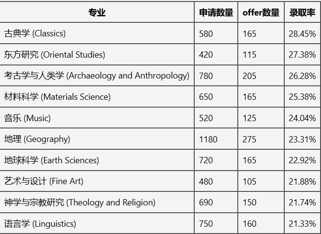 小众文科暗藏机遇:古典学、东方研究、神学等专业录取率超23%,因申请门槛包含语言能力、文化积累等,劝退大量申请者,但对有相关兴趣和基础的学生而言,是“低分高录”的绝 佳选择。