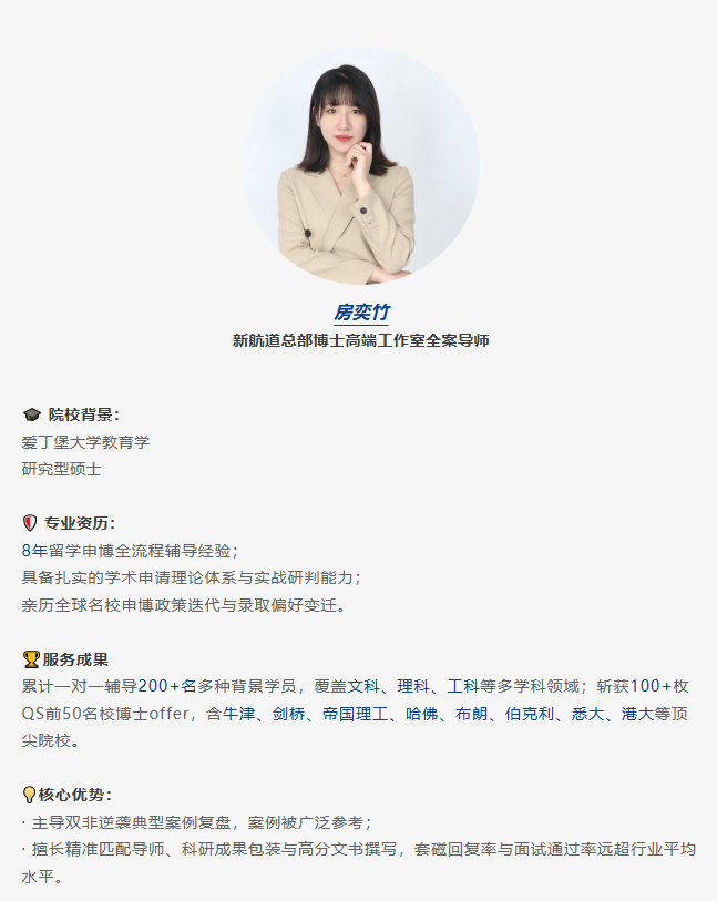 ·擅长精 准匹配导师、科研成果包装与高分文书撰写,套磁回复率与面试通过率远超行业平均水平。