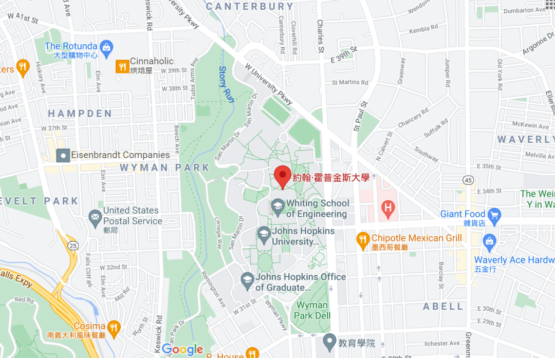 约翰·霍普金斯大学的主校区——霍姆伍德校区(教育学院也在此校区),位于马里兰州巴尔的摩市一个较为富裕且治安良好的区域。