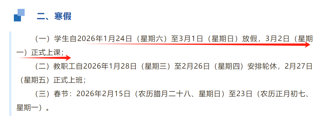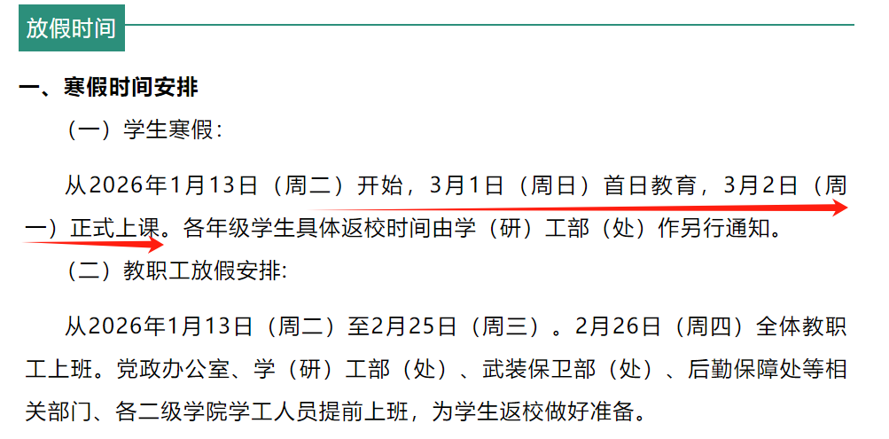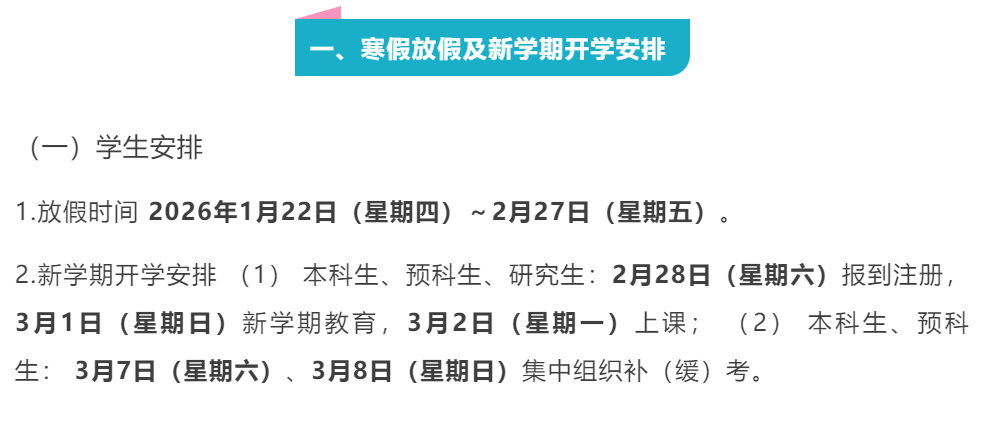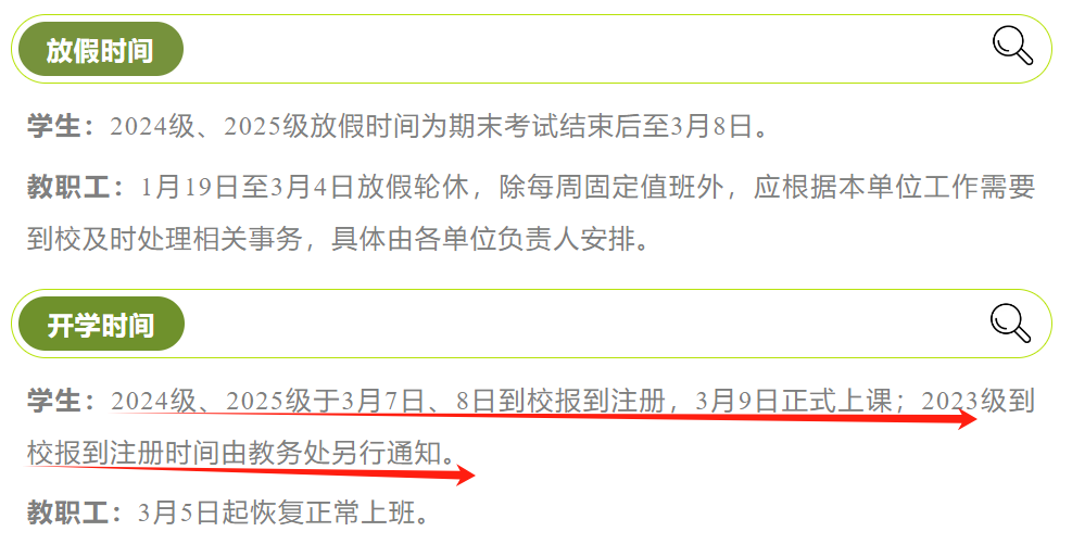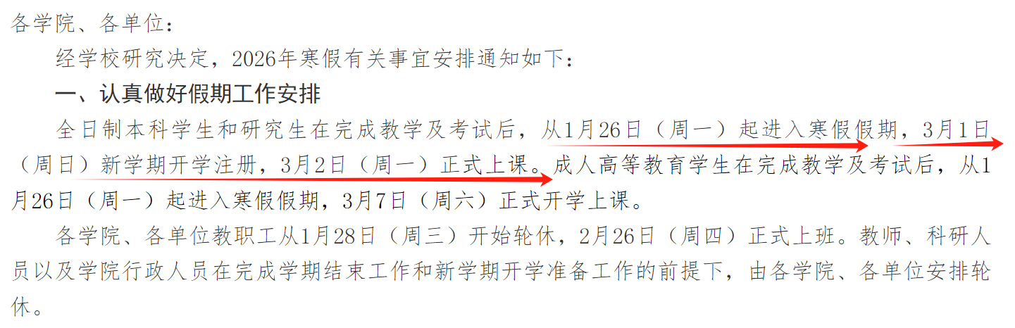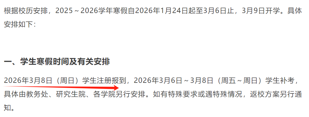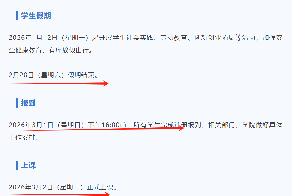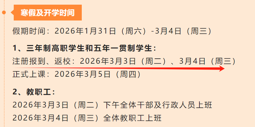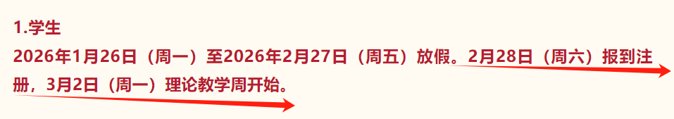 学生:2024级、2025级于3月7日、8日到校报到注册,3月9日正式上课;2023级到校报到注册时间由教务处另行通知。