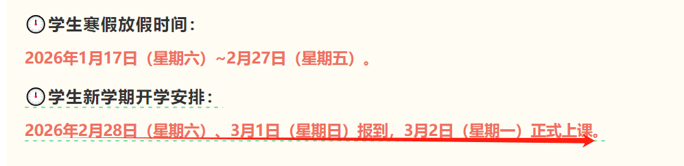 3月1日(周日)新学期开学注册,3月2日(周一)正式上课。