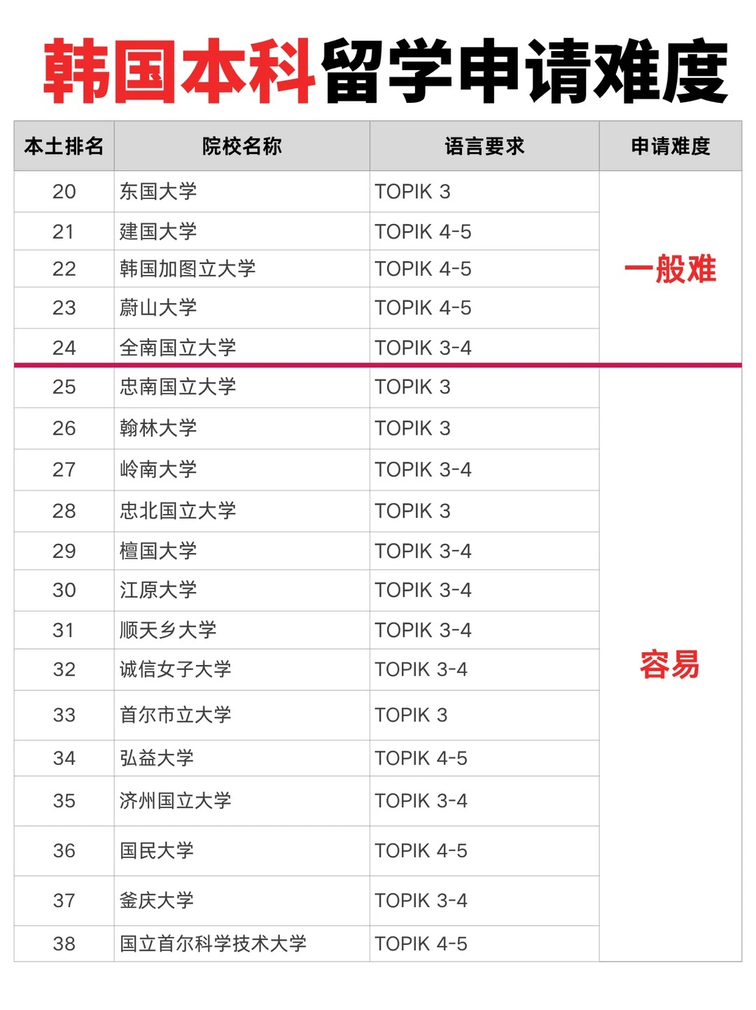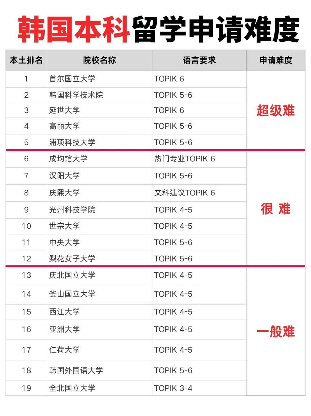 韩国以其高质量的教育资源和独特的文化魅力,正成为越来越多留学生深造的热门选择。从首尔大学的学术殿堂到地方国立大学的性价比之选,韩国高校的多样性与特色为不同背景的学生提供了广阔舞台。然而,每所院校的申请难度与录取偏好各有不同,精 准匹配自身条件与目标学校成为成功申请的关键。本文将为你系统解析韩国热门本科院校的申请难度,助你清晰定位,做出明智选择。