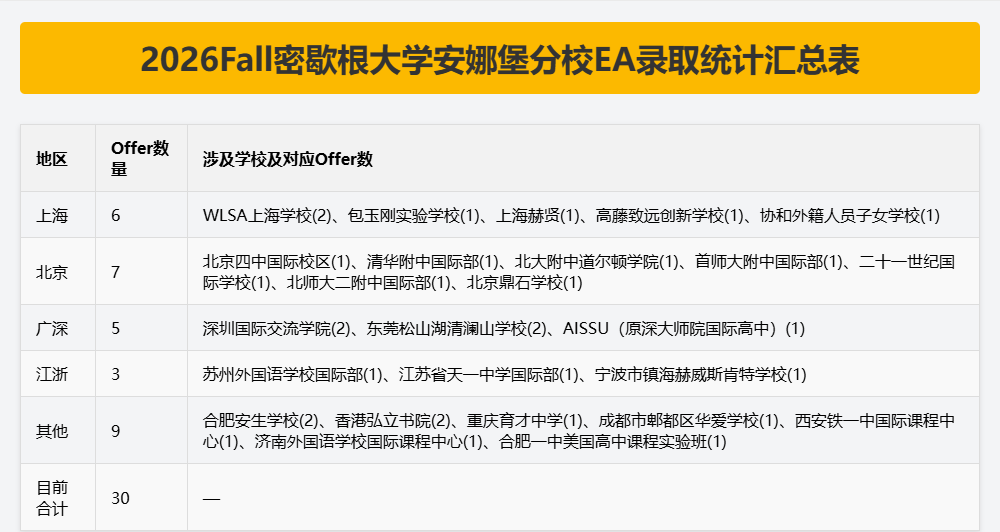 2026Fall密歇根大学安娜堡分校EA轮录取结果已出,对比2025年数据,今年的录取格局发生了明显变化——整体Offer数直接“砍半”,部分热门学校的录取席位也出现了大起大落。