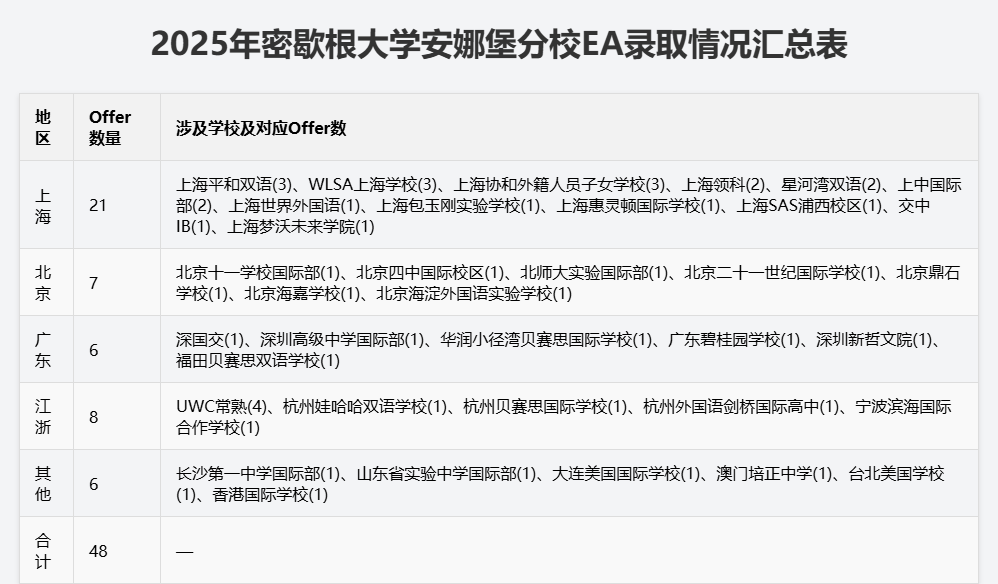 连续两年都是7枚Offer,北京四中国际校区、北京鼎石学校等校连续两年上榜,是密歇根安娜堡的“稳定生源校”。