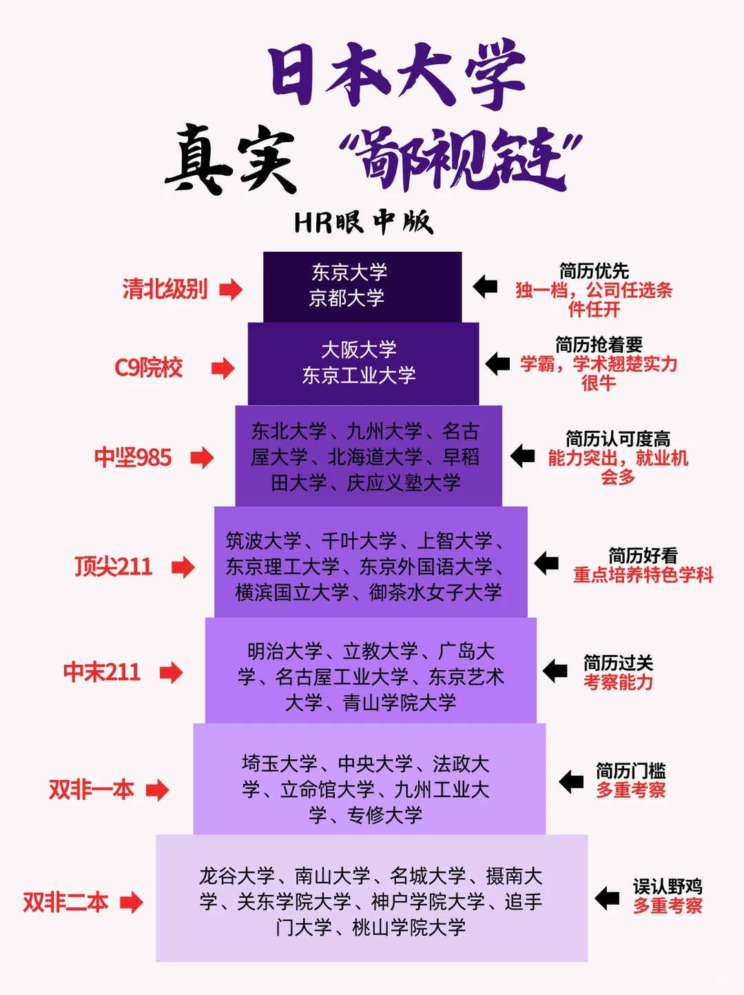 摘要:日本留学圈中,一个隐形的标尺始终存在——大学“鄙视链”。从东京大学、京都大学的神坛地位,到“旧帝大”的地域光环,再到早庆等私立名 校的鲜明标签,院校间的层级与差异深刻影响着求学与求职的路径。这条“链”是客观现实的映照,还是被过度解读的偏见?本文将深入剖析日本高校的生态格局,带你看清各校的真实定位与就业市场的潜在规则,为你的选择提供一份冷静的参考。
