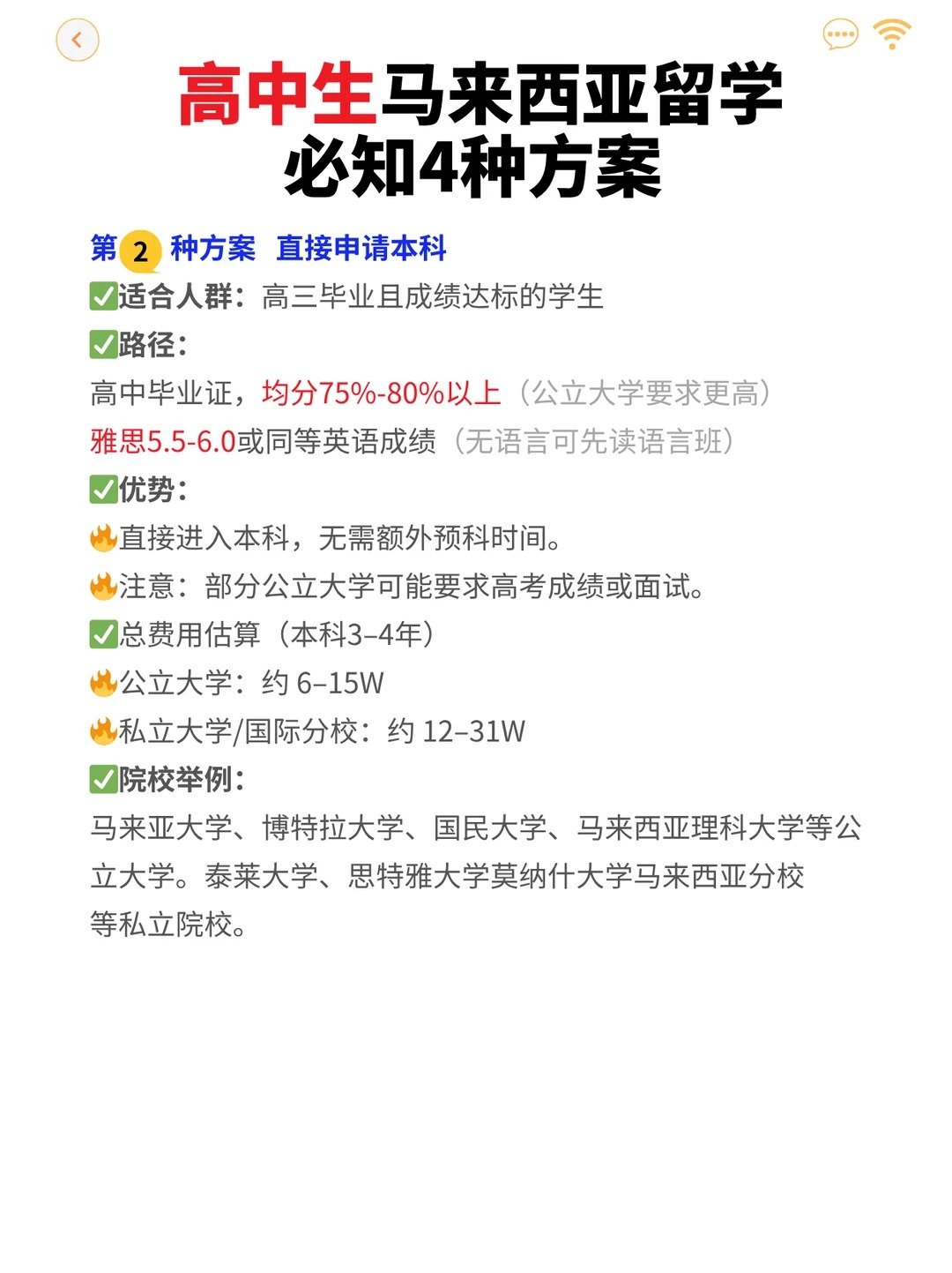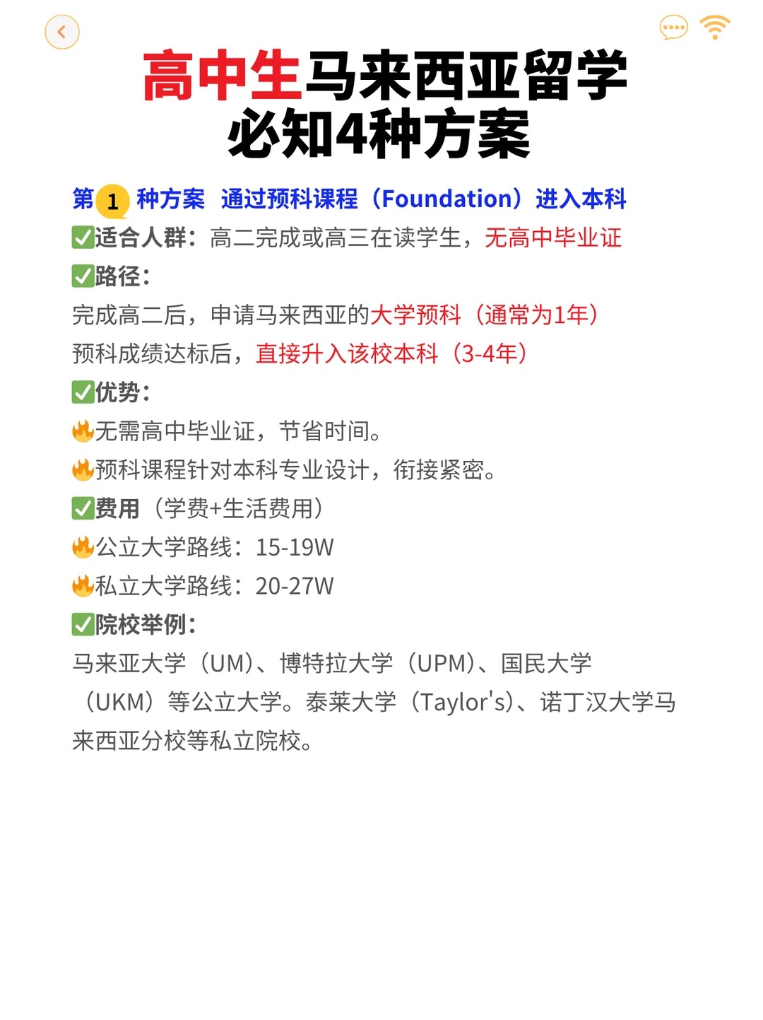 完成高二后,申请马来西亚的大学预科(通常为1年)预科成绩达标后,直接升入该校本科(3-4年)
