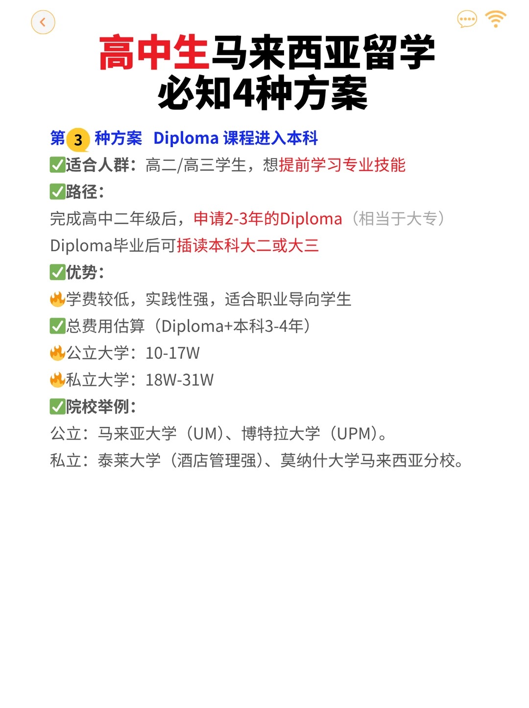 高中阶段留学马来西亚,核心在于匹配:将学生当下的学业阶段、成绩水平与留学方案精 准对接。无论是想节省时间的预科、追求高效直录的本科申请,还是注重技能培养的Diploma课程,抑或是国际课程的学分转化,每一条路径都指向更广阔的国际教育可能。建议学生与家长尽早梳理自身情况,明确目标,在专业指导下选择最适合的赛道,让留学真正成为学业生涯的增值跳板,而非仓促之选。