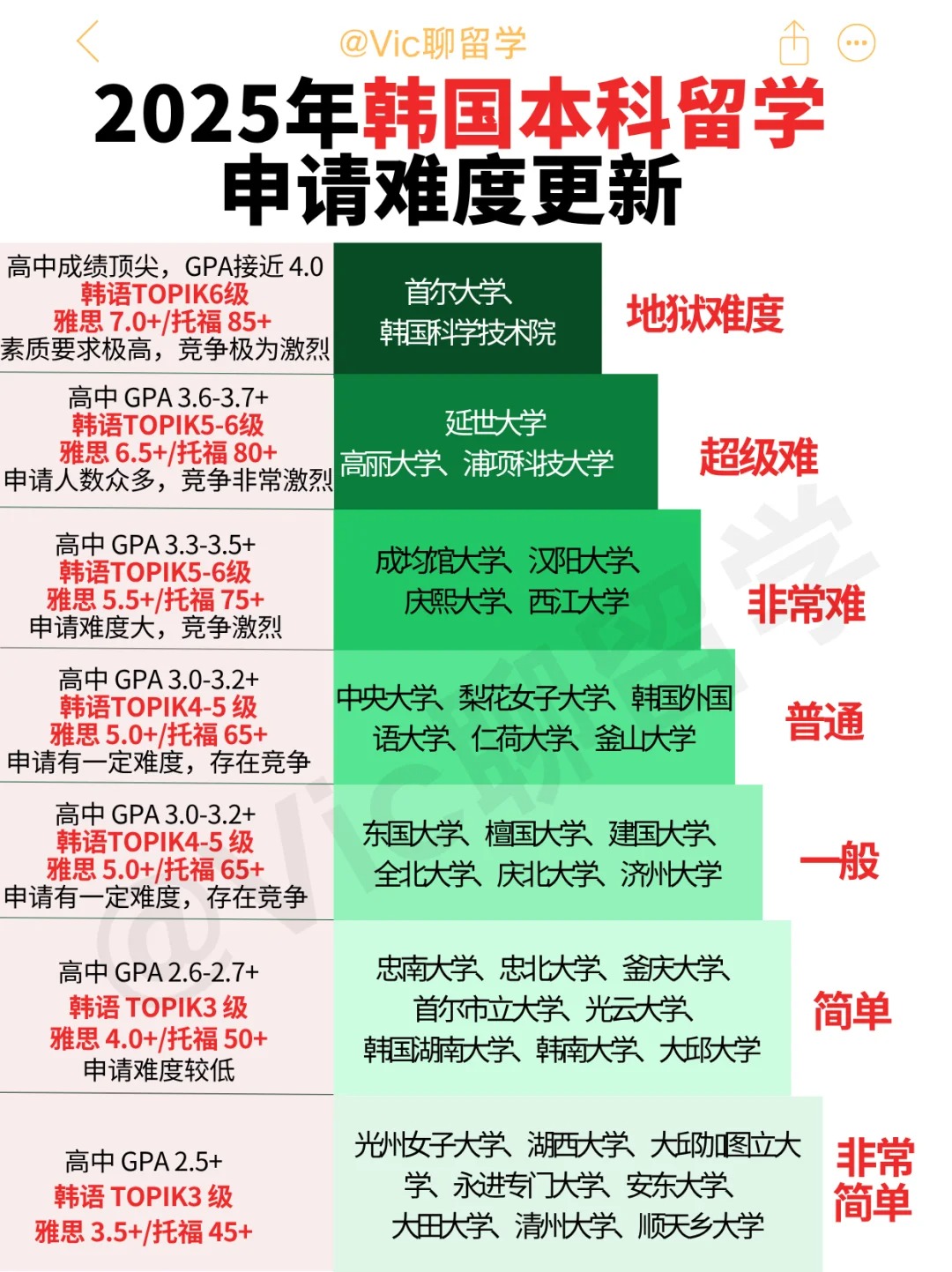 热门校(难):成均馆、汉阳、庆熙——GPA3.3-3.5+、Topik5-6级雅思5.5+。