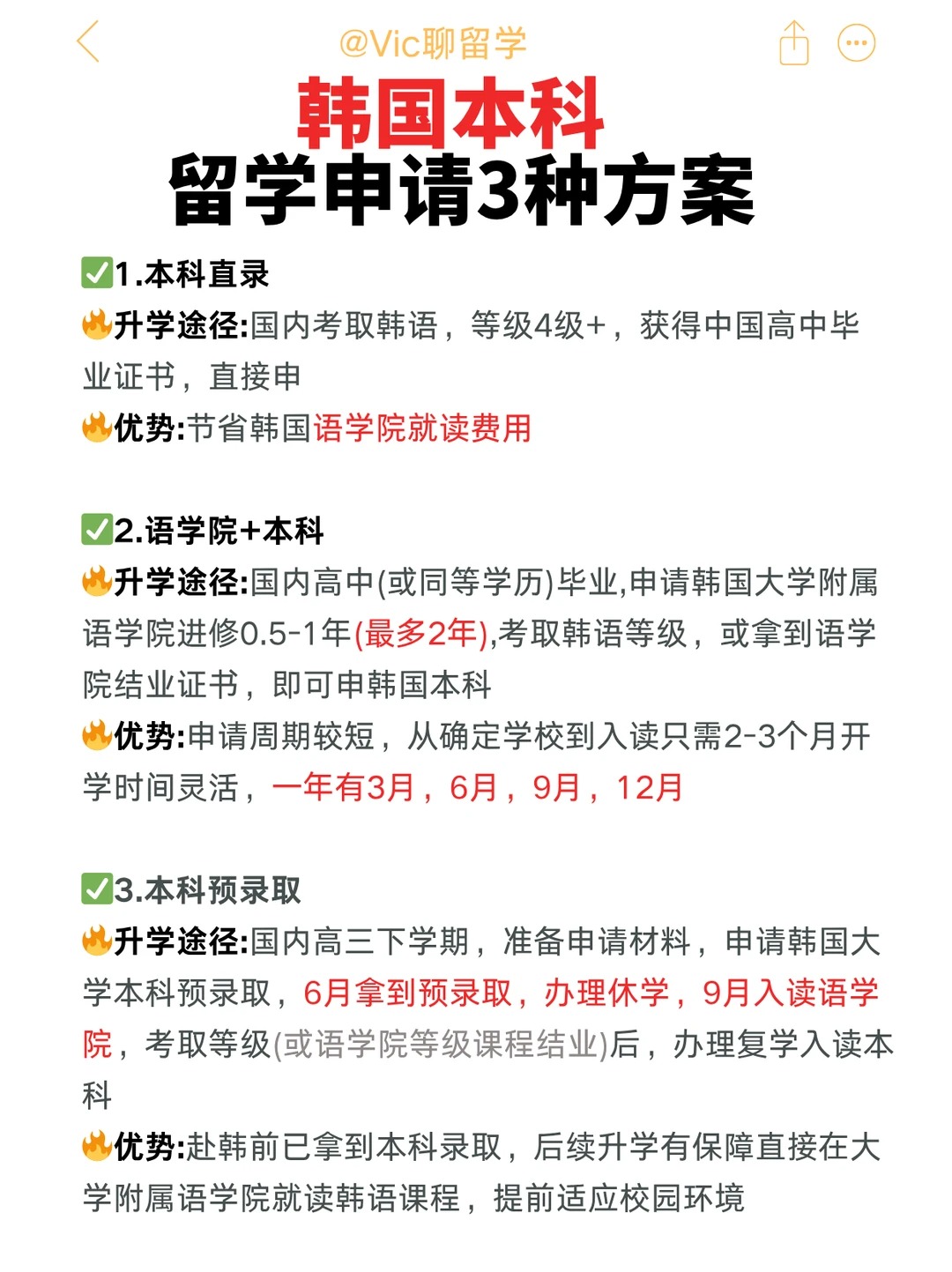 升学途径:国内高三下学期,准备申请材料,申请韩国大学本科预录取,6月拿到预录取,办理休学,9月入读语学院,考取等级(或语学院等级课程结业)后,办理复学入读本科