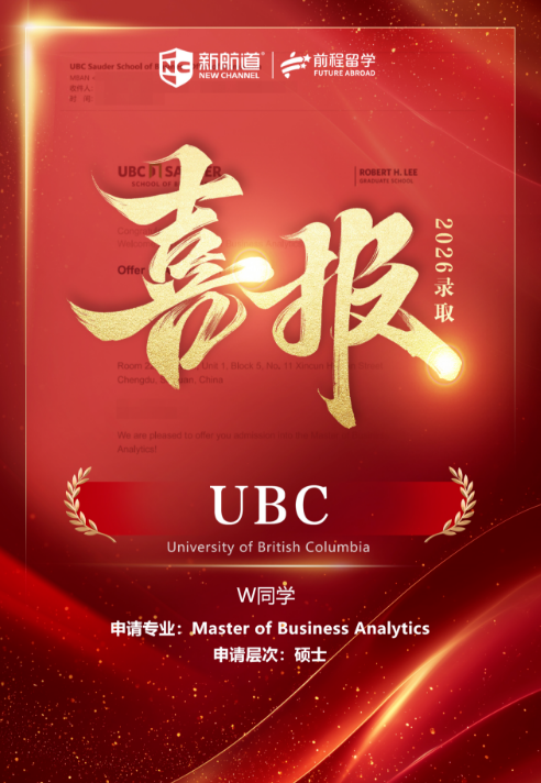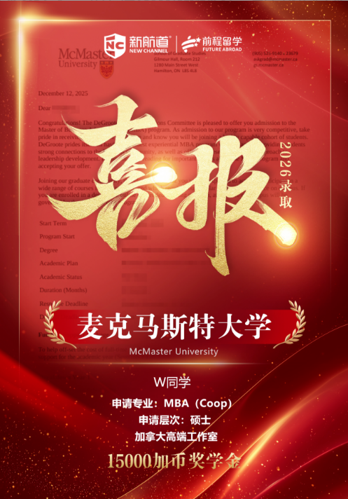 摘要:在全球职场环境充满变数的今天,留学选择的锚点正从“名 校光环”转向更务实的“职业出口”。这一趋势在最 新公布的2026申请季录取中清晰显现:新航道学员接连斩获的麦克马斯特大学MBA-Coop(带高额奖学金)与英属哥伦比亚大学(UBC)商业分析硕士两大顶 级录取,完美诠释了加拿大商科教育的核心逻辑——就业导向、实习捆绑与移民友好的“黄金组合”,为追求确定性的学子指明了一条稳健路径。