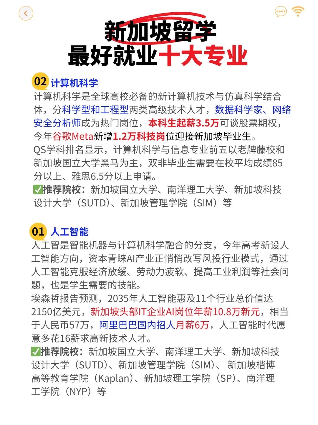 对于众多将目光投向新加坡的留学生而言,选择一个未来前景广阔、就业竞争力强的专业,无疑是实现留学价值的关键一步。从引领全球科技浪潮的人工智能,到作为数字经济基石的计算机科学,再到持续繁荣且急速转型的金融服务领域,新加坡不仅提供了世界顶 尖的教育资源,更与产业前沿紧密对接,为毕业生铺就了通往高价值职业的黄金赛道。本文将为您深度解析新加坡最 具就业优势的十大专业,帮助您在规划留学之路时,做出更明智、更具前瞻性的选择。