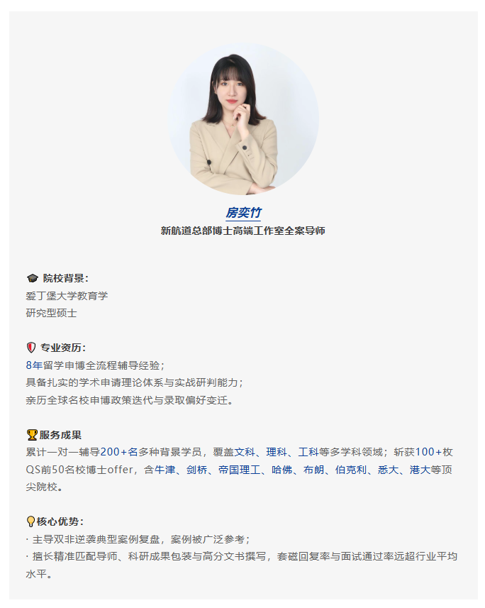 综上所述,祁同学的成功并非偶然,而是长期科研积累、理性择校与专业申请策略共同作用的必然结果。他的经历清晰地表明,博士申请的核心在于“匹配”而非盲目追逐排名,在于将个人独特的科研故事精 准呈现给对口的导师与项目。无论是牛津面试后的复盘调整,还是针对不同导师定制研究计划(RP),每一步都体现了规划的科学性。对于有志于攀登学术高峰的学子而言,尽早明确方向、夯实成果,并善用专业指导,方能将梦想照进现实,在世界顶 尖的实验室里,开启属于自己的科研征程。