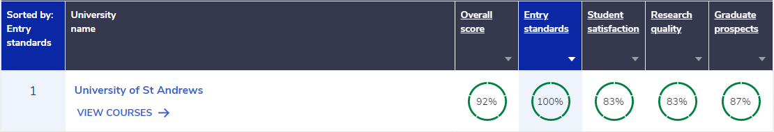 CUG排名涵盖十个评价指标,其中“入学标准”以入学新生的平均UCAS分数为排名依据。这意味着,在“入学标准”这一指标上排名越靠前,该校录取学生的整体成绩水平越高。