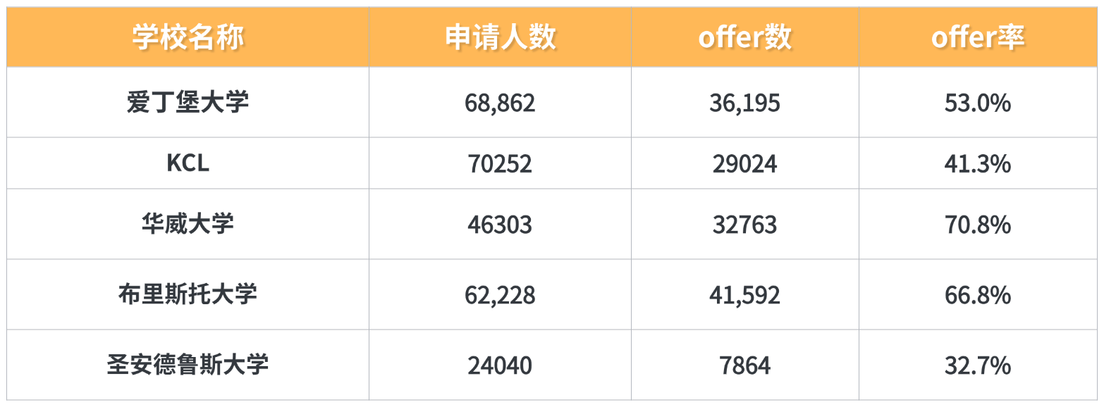 总offer率是衡量一所大学申请难度的重要指标之一。除了G5院校之外,申请者关注度较高的热门院校中,offer率最 低的两所院校竟是圣安德鲁斯大学和伦敦国王学院(KCL)。