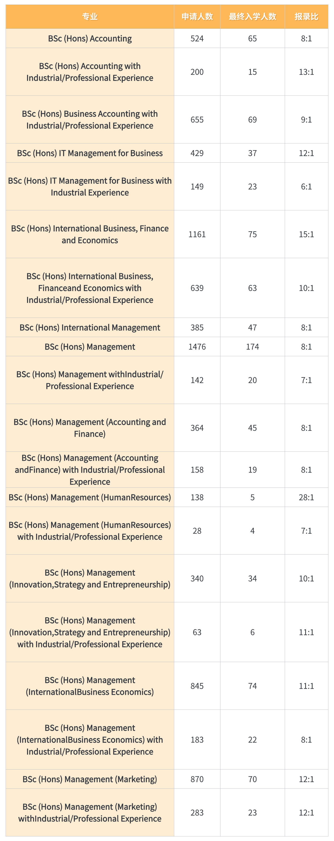 其中,会计专业(含工业经历)的申录比为13:1,国际商务、金融与经济专业的申录比为15:1,管理(市场)专业的申录比为12:1,而管理(人类研究)专业的申录比更是高达28:1。对于目标为这些专业的申请者而言,需要谨慎评估自身实力,做好充分的申请规划。