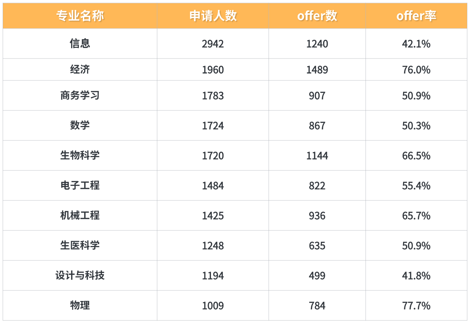 在了解了各院校的整体offer率之后,我们接下来将聚焦专业offer率,选取中国学生申请较为集中的几所大学,分析其热门专业的申请难度。