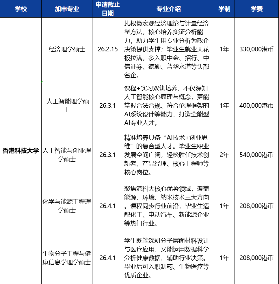 港科大商学院、工程学院多个王 牌硕士专业都新增了申请轮次,截止日期从2月一路延至4月,覆盖经济学、人工智能、化工能源等热门方向。