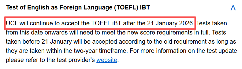 摘要:近日,英国G5名 校伦敦大学学院(UCL)正式宣布,自2026年1月21日起全面认可新版托福考试成绩,并同步更新了各语言等级对应的分数要求。这一政策调整,不仅为计划申请UCL的学生提供了明确的语言备考方向,也进一步凸显了国际化语言考试在留学申请中的关键作用。无论你目标的是理工科、商科还是人文社科,精 准掌握UCL的语言等级划分与分数对照,将成为你迈向梦校的重要一步!