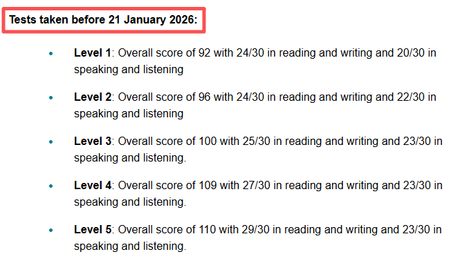 参加的新托福考试,每个Level对应的托福总分与单项要求如下↓