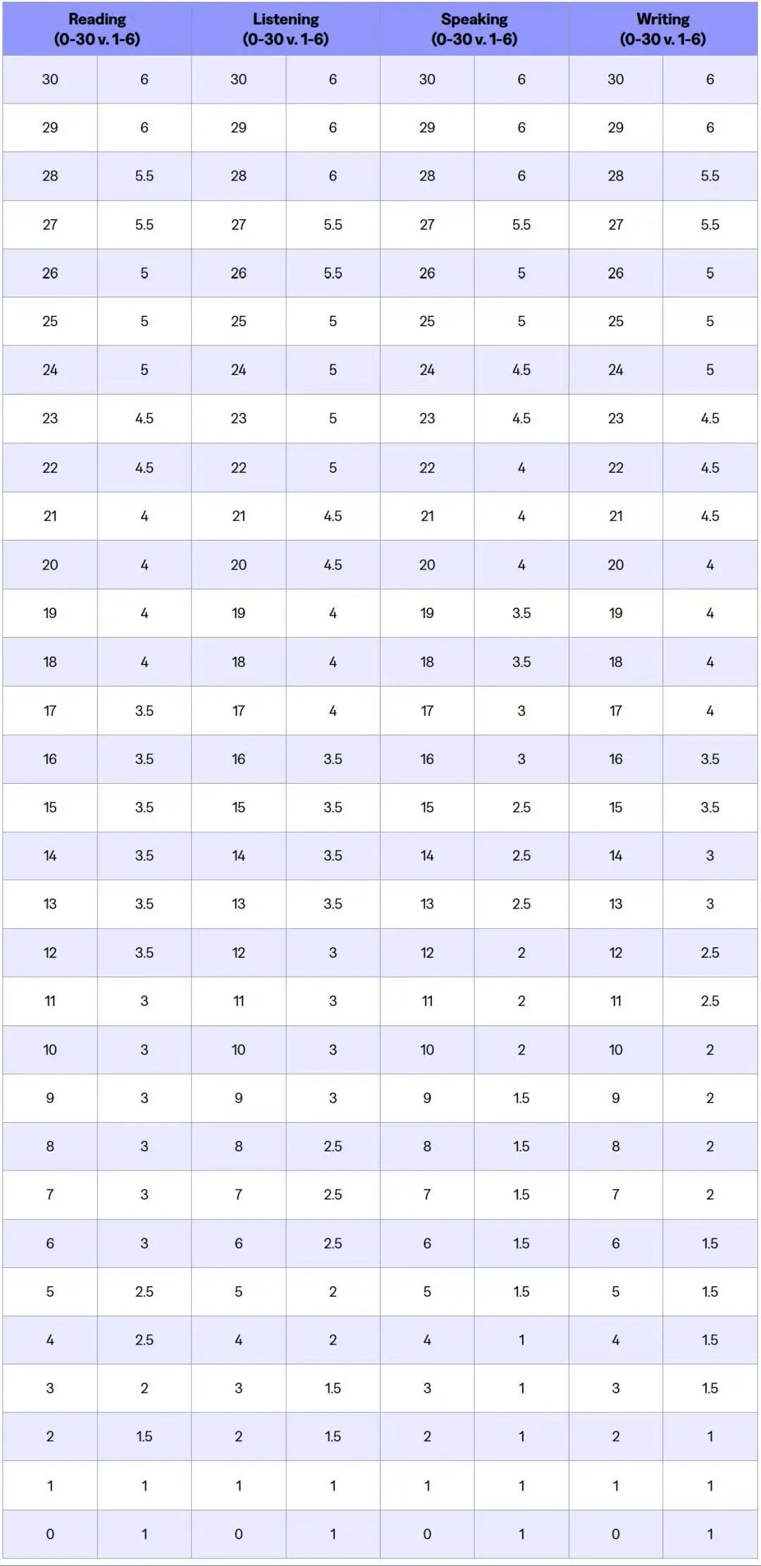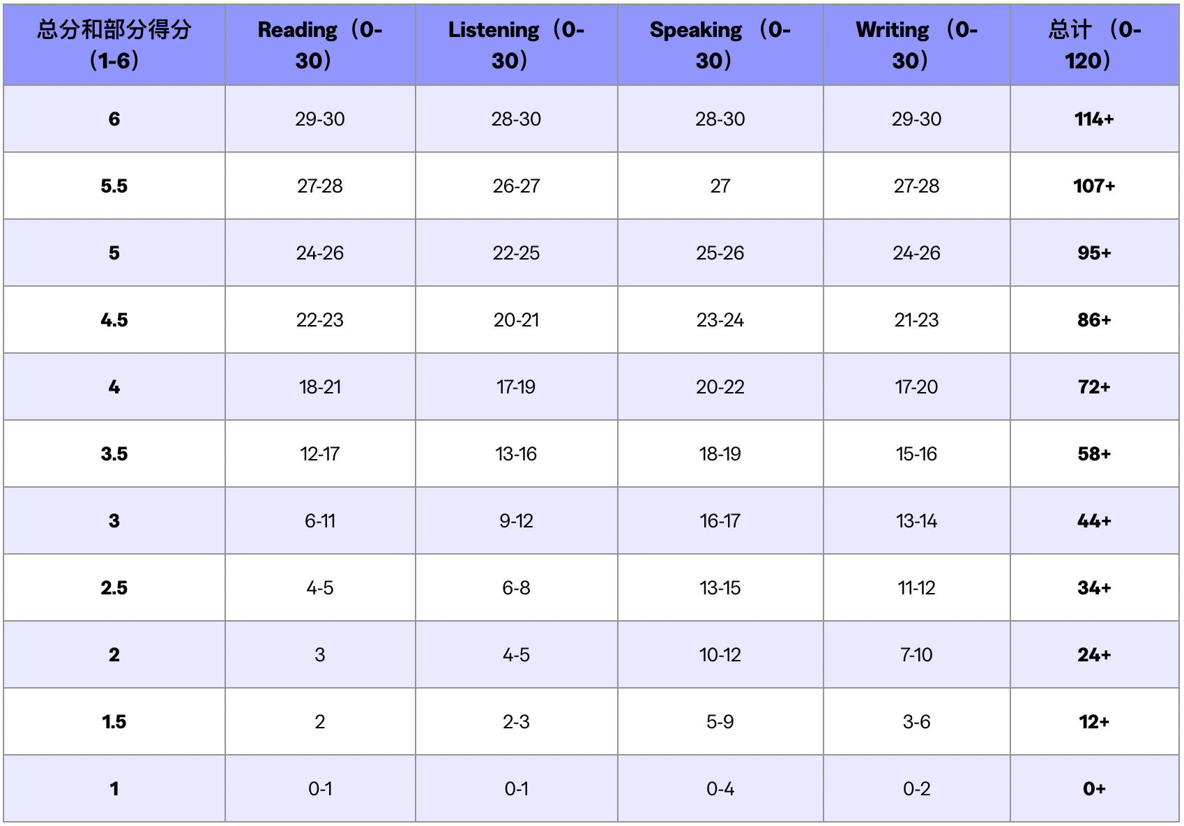 新托福总分改为1–6分制(按0.5分进位),单项也采用1–6分评分;总分由四个单项分数的平均值决定,并严格遵循四舍五入至最近0.5分 的规则。