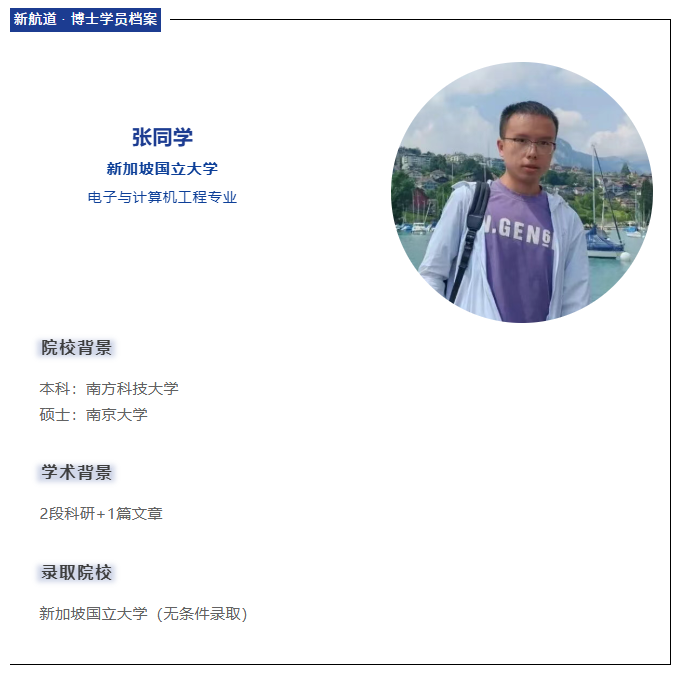 摘要:在理想与现实交织的成长道路上,张同学始终以清晰的自我认知为导航,将热情与行动力注入生活与学术的每一步。作为一名典型的ENFJ/INFJ型理想主义行动派,他不仅在音乐、书籍与旅途中汲取世界的辽阔,更在科研的严谨与篮球、游戏的活力间寻找平衡。当留学梦想在心底生根,他凭借扎实的学术积累——优异的GPA、达标的语言成绩与一区论文——稳步走向国际舞台。最终,他叩开了亚洲顶 尖学府新加坡国立大学的大门,用行动诠释了:理想主义者的远方,始于脚下坚定的足迹。