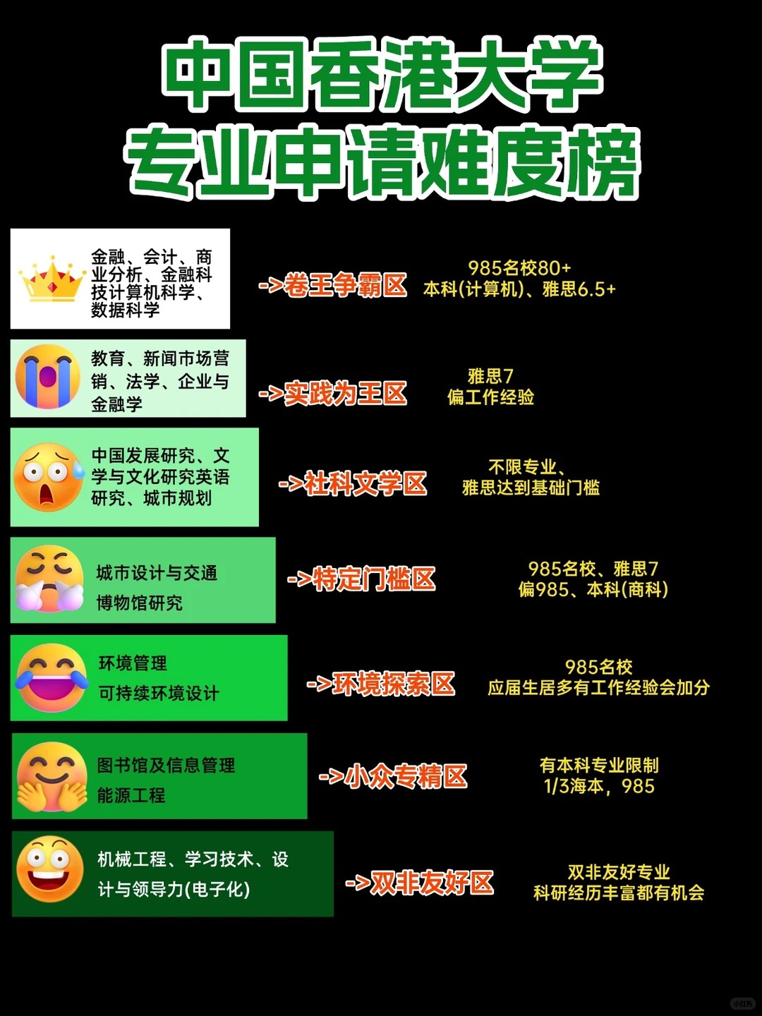 选择专业,本质是一场信息战与自我定位的结合。港大各专业的申请难度虽层次分明,但并没有绝 对不可逾越的壁垒。关键在于:清晰认知自身优势(院校背景、实践经验、语言能力),并精 准匹配专业偏好。希望这份分区的解析,能为你拨开申请迷雾。无论你身处哪个赛道,提早规划、扎实准备,才是通往港大的不二法门。祝每位同学都能锚定方向,成功上岸!