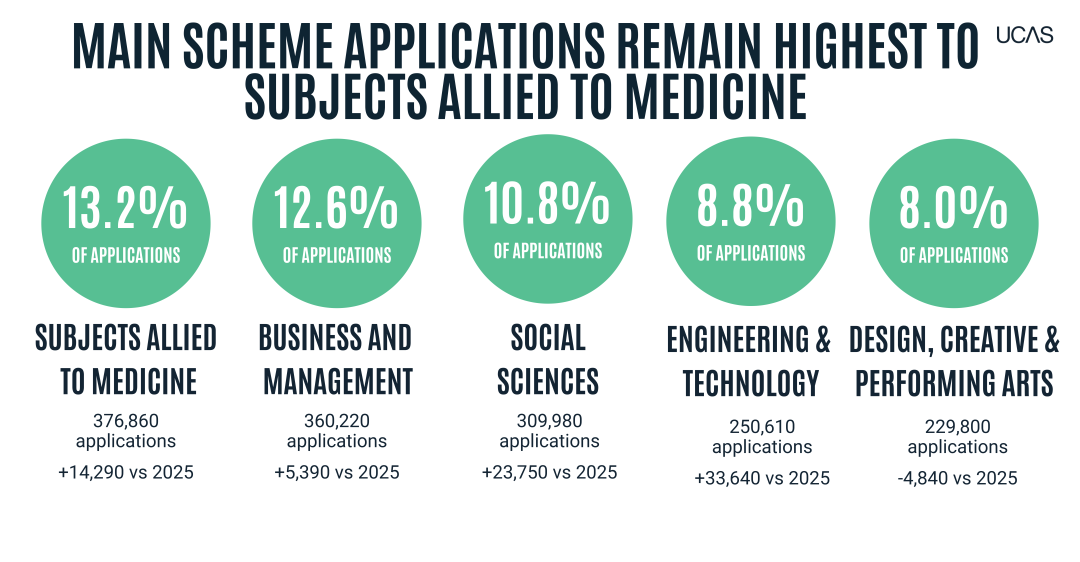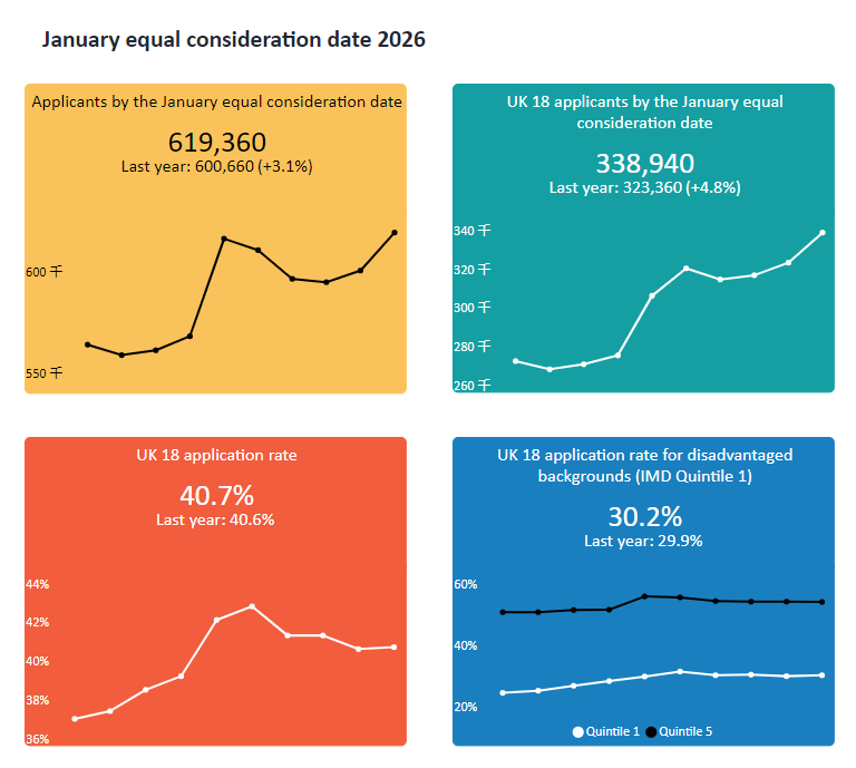 截至1月14日,申请2026年入学英国本科的人数为619,360人,比2025年同期入学申请人数的600,660人增加了18,700人。