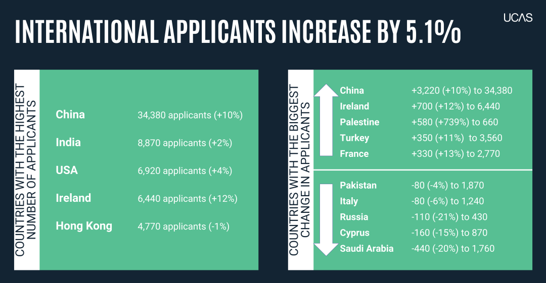 中国大陆地区:通过UCAS申请英国本科的学生人数为34,380人,比上个申请季(31,160人)增加3220人,同比增长约10.33%。