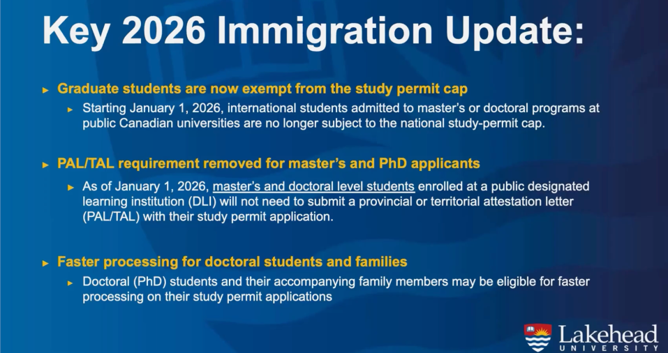 2026年1月1日起,前往公立院校(包括湖首大学)就读硕士和博士项目的国际学生在申请学习许可(Study Permit)时,不再需要提供省级证明信(PAL)*,这意味着研究生学生不再受国际学生签证配额限制,加拿大政府非常欢迎有志于攻读研究生学位的国际学生来加深造。