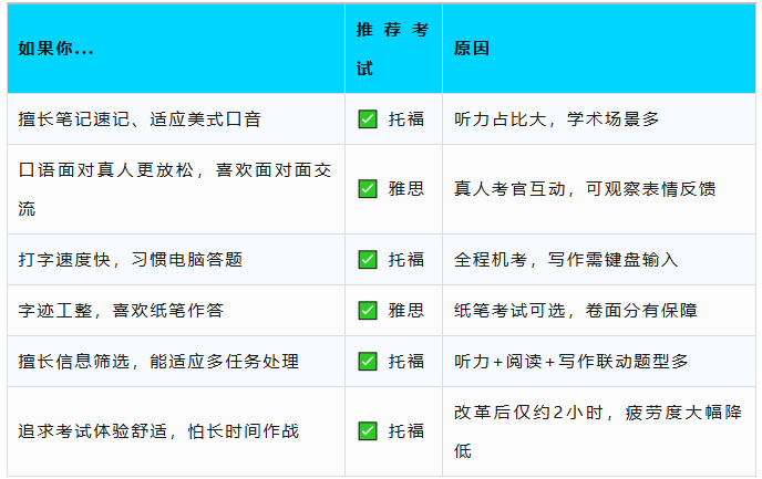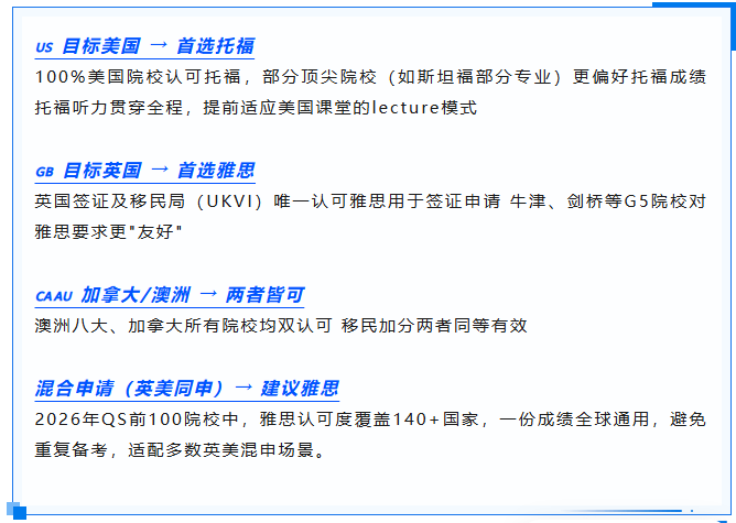 高三/大四学生(时间紧迫)看目标院校小分要求:雅思小分卡得严(如写作6.5),托福总分达标即可。急需成绩选托福(出分快),追求稳妥选雅思(题型熟悉)