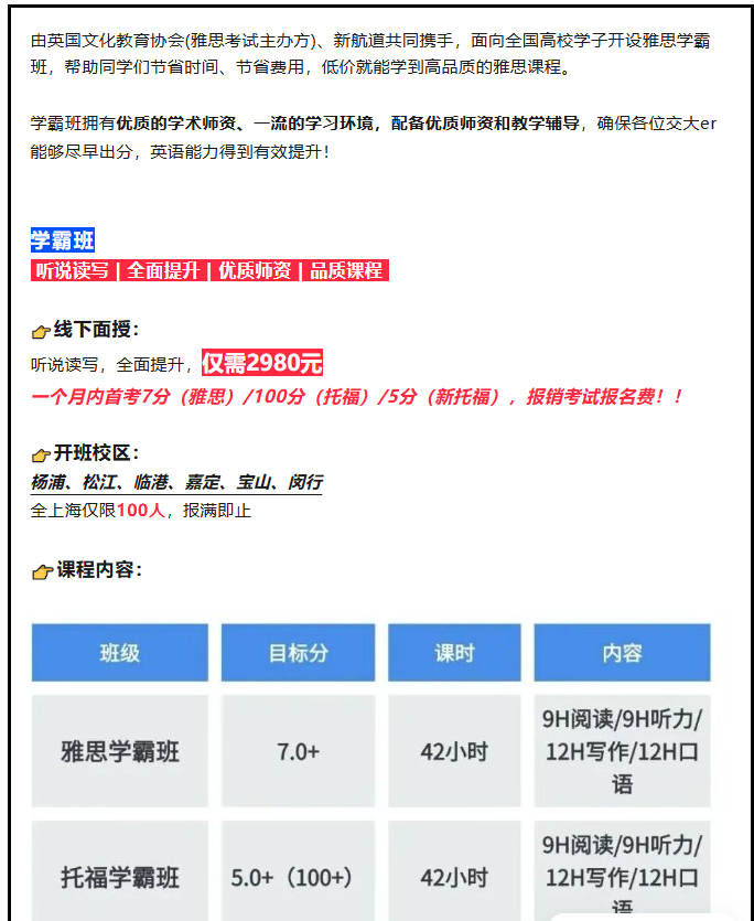 机会总是留给有准备的人。新航道雅思/托福学霸班,不仅为你节省时间和费用,更配备优质师资和全方位教学支持,助你在英语学习路上事半功倍。全上海仅限100个名额,先到先得!现在就联系在线客服报名,开启你的英语高分之旅吧!