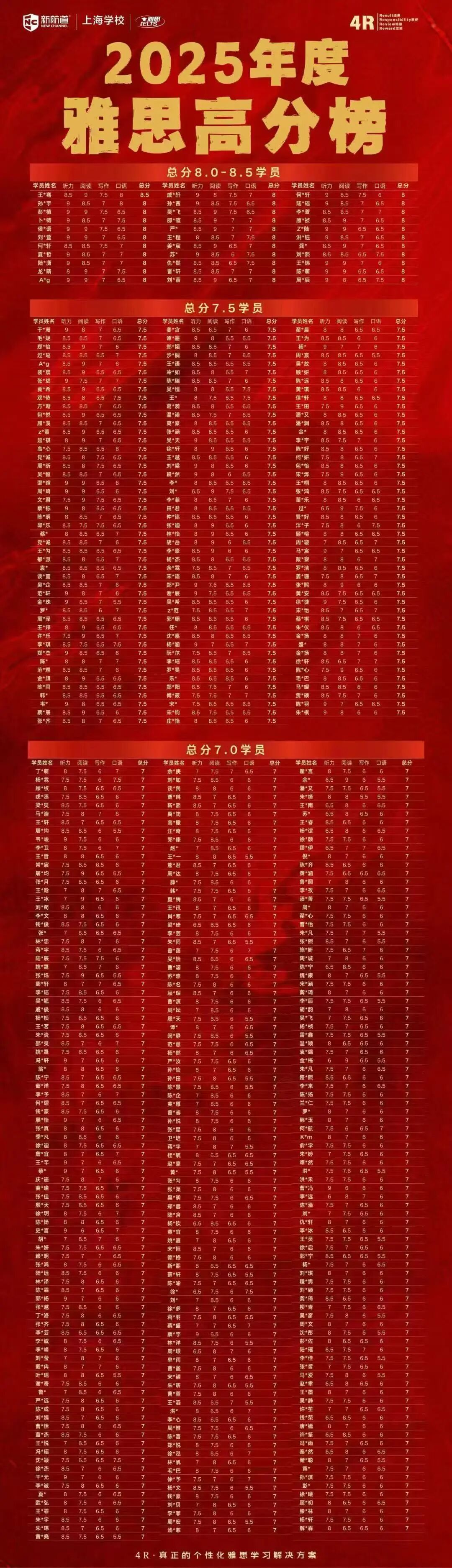 新航道上海学校2025年雅思高分榜