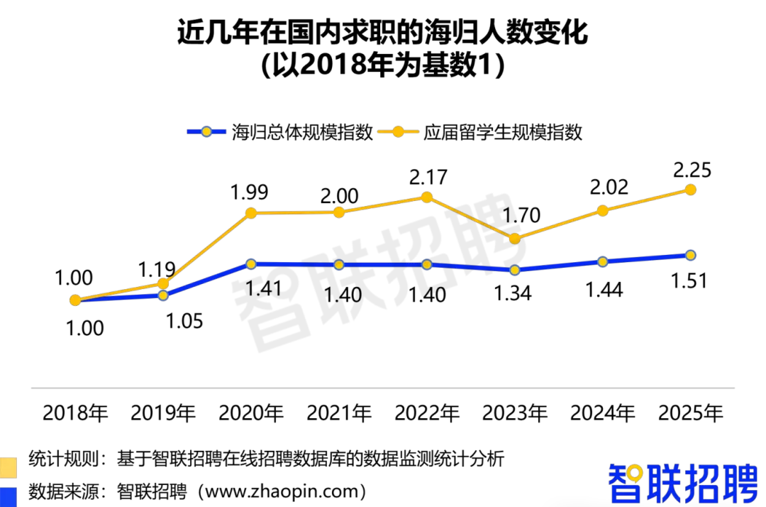 报告显示,2025年回国求职的海归人数较上年增长5%,达到2018年的1.51倍;其中,应届留学生回国求职人数同比增幅高达12%,是2018年的2.25倍,创下近八年以来的最 高纪录。