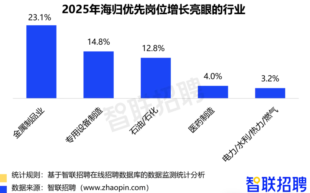 同时具备技术背景与国际经验的复合型海归愈发抢手。2025年,金属制品业、专用设备制造、石油/石化等行业的海归优先岗位增速位居前列,医药制造、电力/水利等行业也持续增长。
