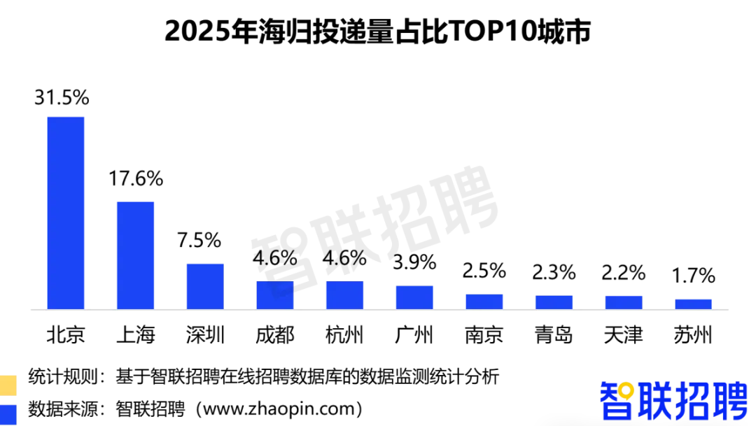 但一个有趣的现象值得注意,海归人才“下沉”趋势愈发明显,2025年,三线、四线、五线城市的海归投递增速均远超一 线和新一 线城市。