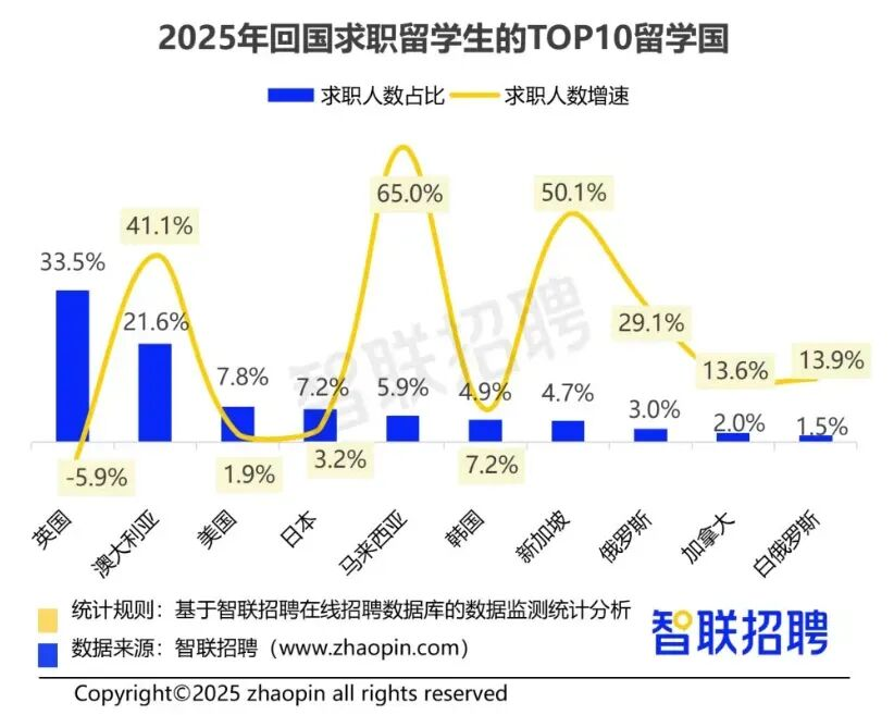 但从增长动能来看,亚洲留学地正在成为新的“引擎”——马来西亚留学生回国求职人数同比增长65%,新加坡增速也高达50%,远超传统留学大国。