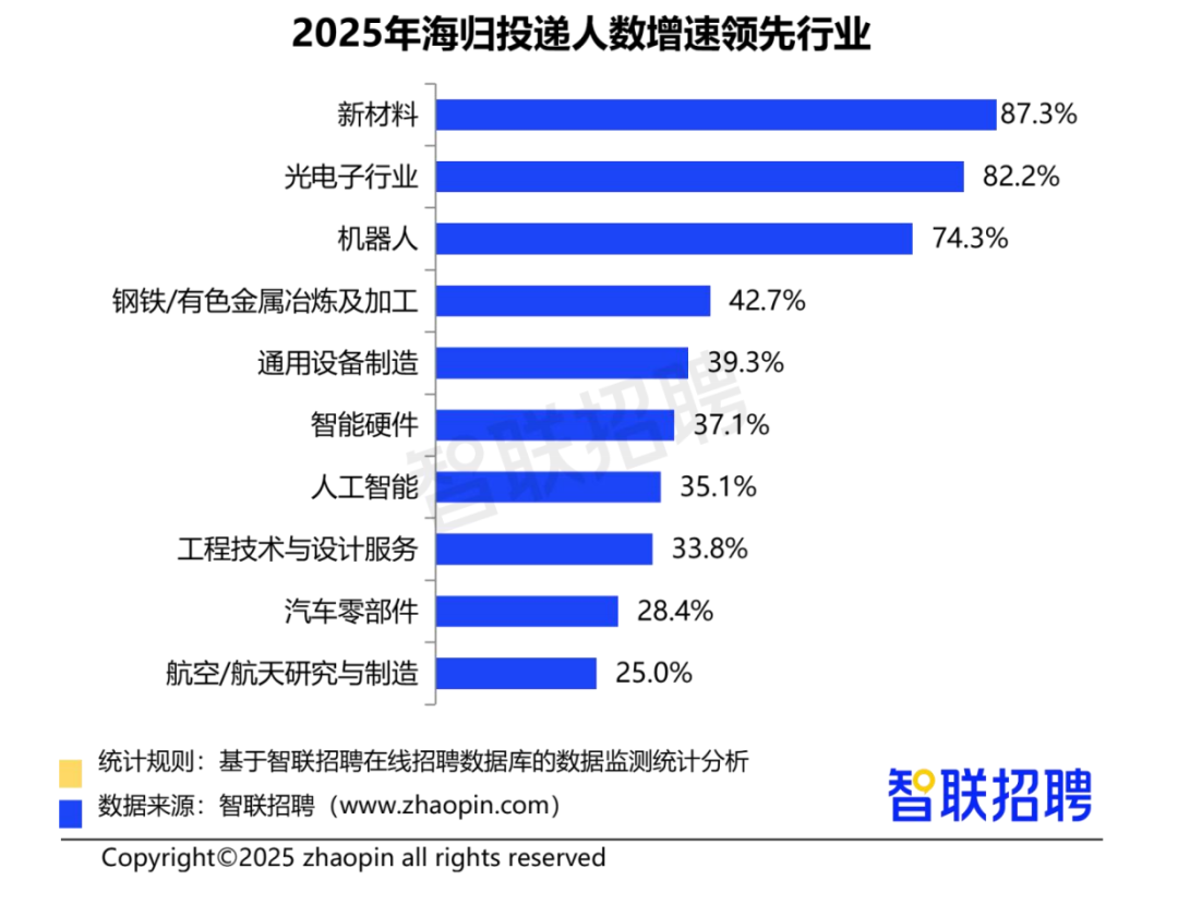 2025年,海归投递人数增速领先的行业多为新一代信息技术、高端装备等领域: