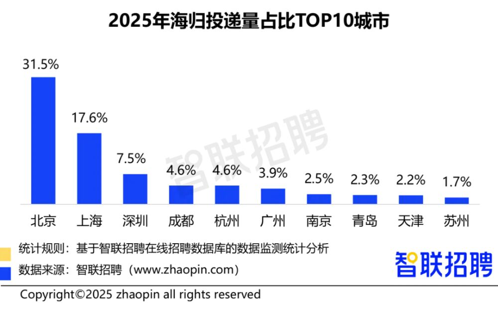 从地域分布看,北京、上海、深圳稳居海归求职城市前三甲,投递量占比分别为31.5%、17.6%、7.5%。成都、杭州、广州紧随其后,前十大城市吸纳了近八成的海归求职投递。