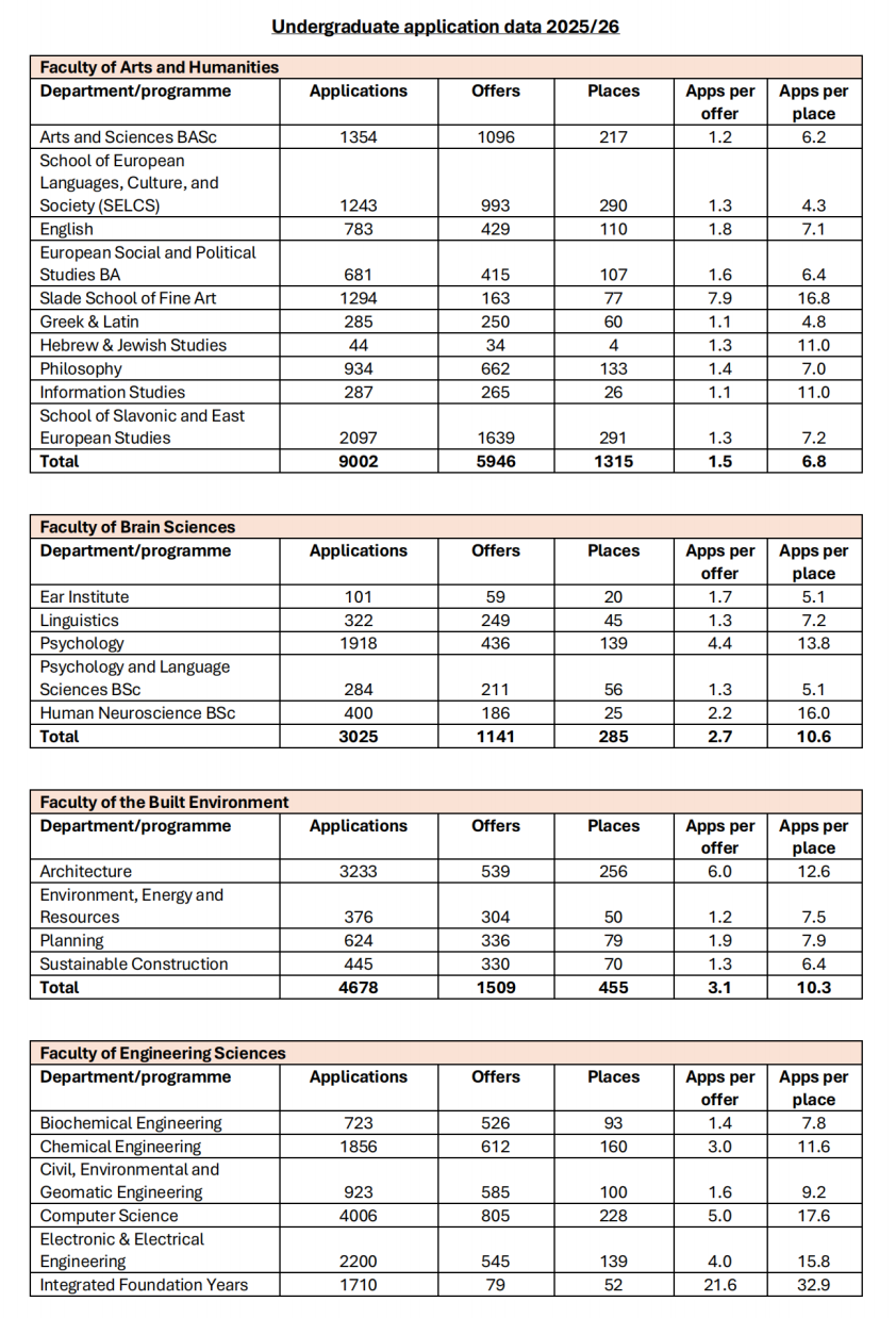 根据UCL官方发布的2025Fall(2025/26学年)本科招生数据,申请热度再创新高,竞争依然激烈: